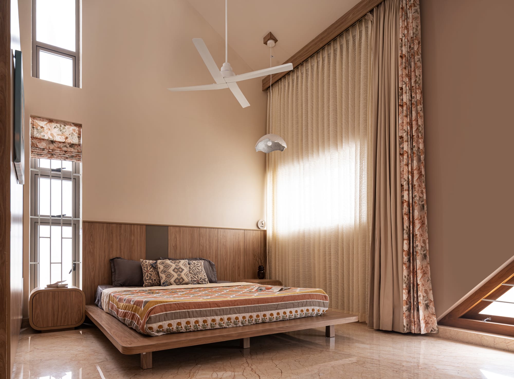 In the private quarters, the saga of balanced textures and audacious, sweeping contours seems to carry on uninhibited. By extending the height to the peak of the gables, the rooms evoke a sense of verticality, making the spaces feel capacious, almost double-height. This architectural gesture does more than amplify scale—it reinforces the Mediterranean character of the home from within.