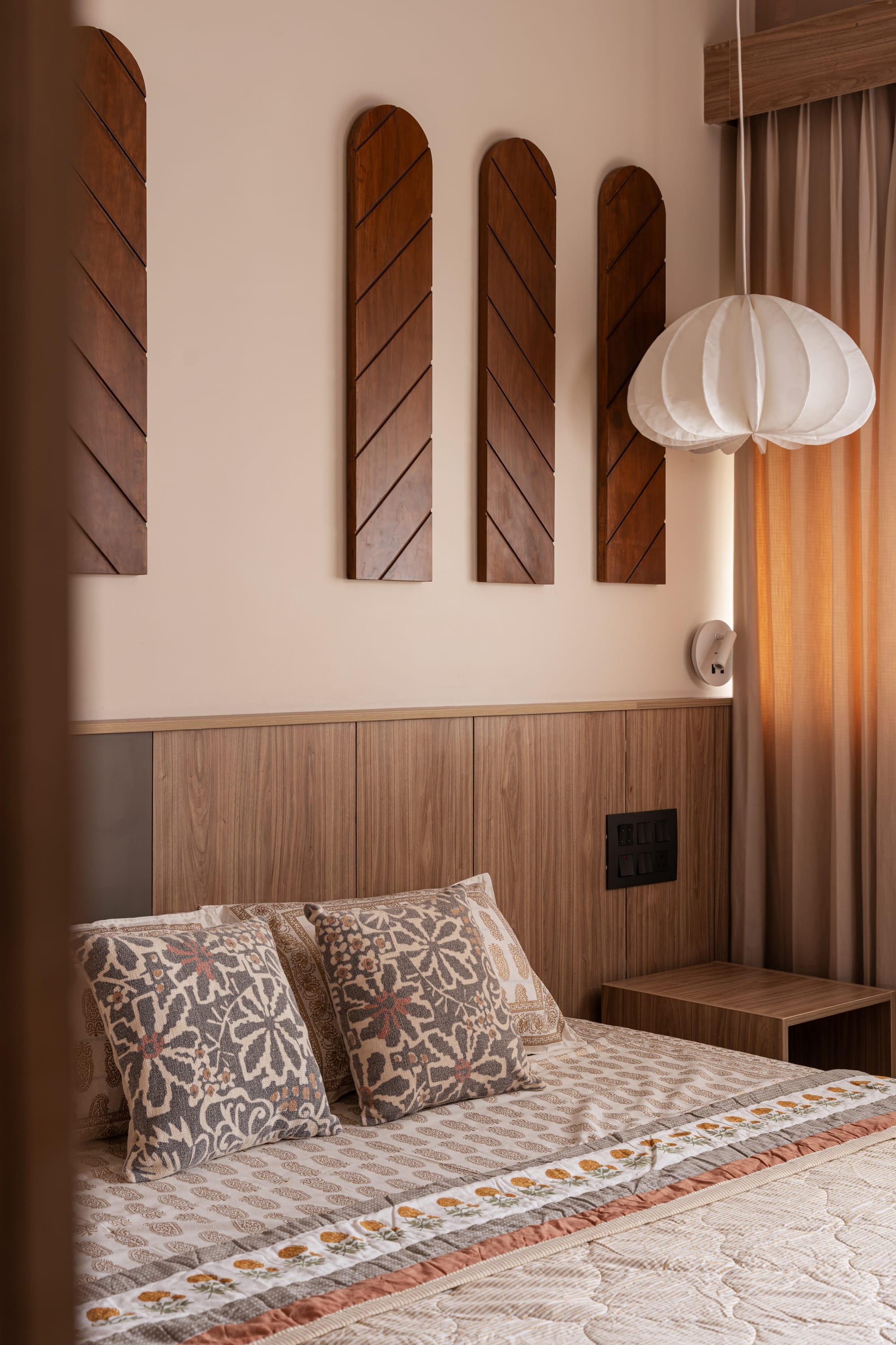 Another elegant design intervention that eventually resonates as a leitmotif throughout the home is the use of warm wood, which, to the designers, was perhaps one of the most bohemian flourishes, working like a charm against the crisp, muted pastel walls. It manifests as a series of reclaimed balusters mounted as wall art, in the Nordic-style table where the family congregates for their daily meals in the dining area, in slatted headboards that anchor the bedrooms, and even articulated as half-moon accents snugly wrapping columns like a sleeve.