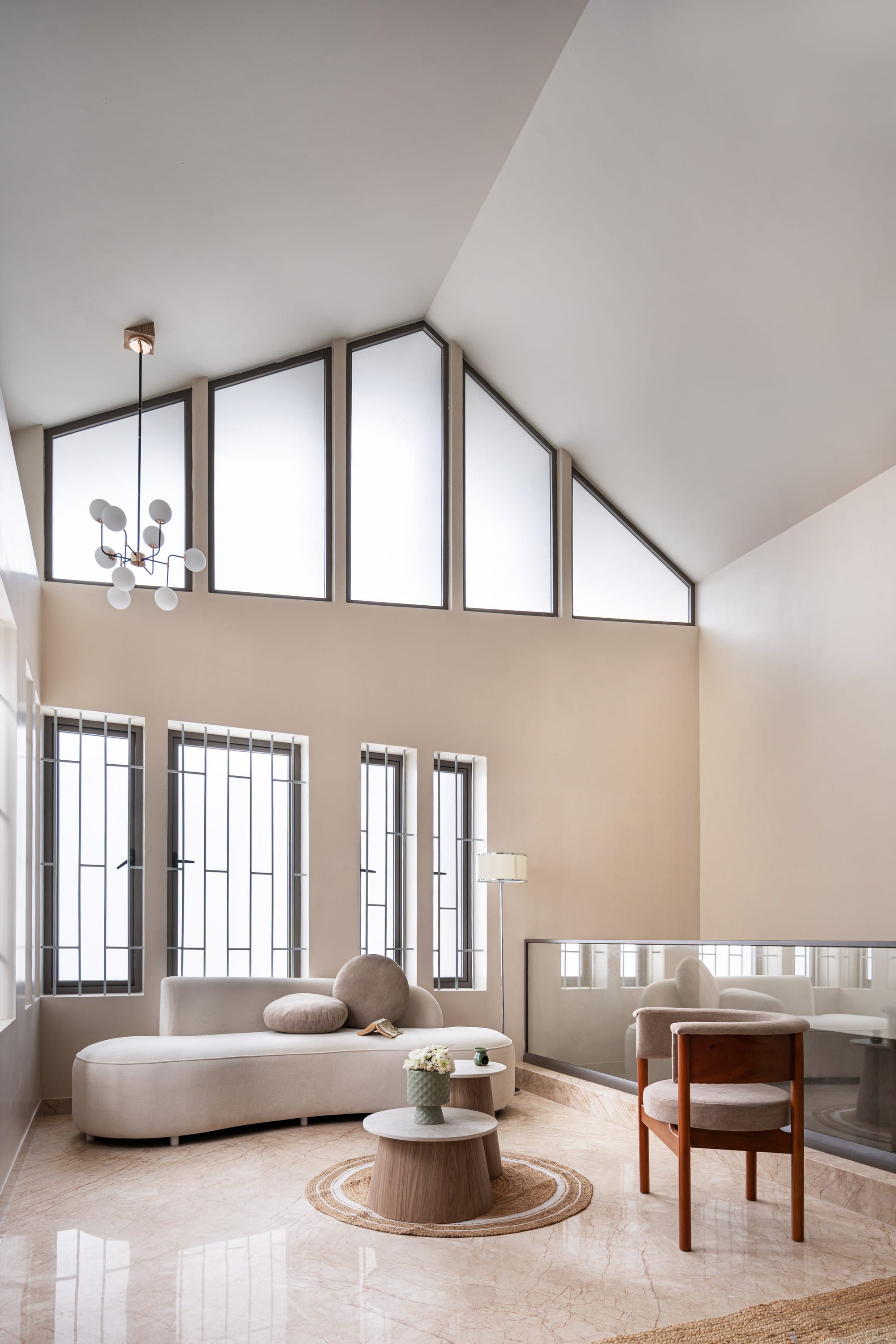 The bones of this four-bedroom residence are fortified with an emphasis on a clear, sequential progression of spaces. A deft inclusion of liminal, transitional zones emerges at the forefront; the Spanish Revival portico becomes an uncanny body double for a built-in ‘thinnai’, with the unexpected addition of fins lending structural support and a dynamic interplay of light. The design choices follow suit with a worldly, multicultural flair. Italian marble sprawls underfoot, imbuing the interiors with a silky-smooth, luxuriant feel, while soft eggshell and stonewall grey walls with cool blue undertones prevent the home from absorbing excess radiation.