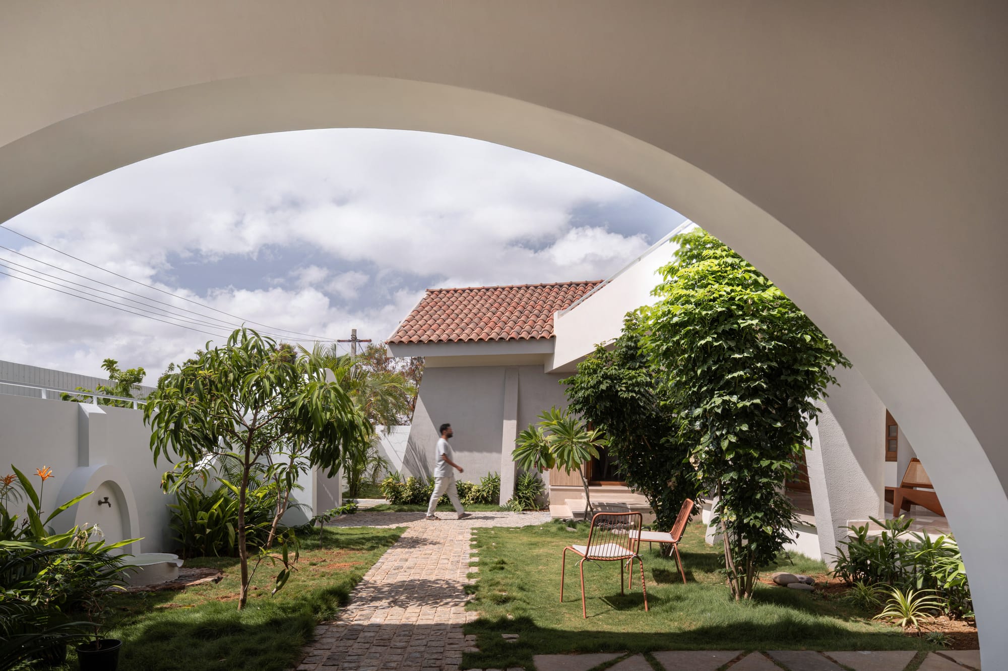 Framed within a climate-responsive typology, the 4,600 sq. ft. Tiruppur home by Tales of Design Studio telescopes through arches, double-height volumes and gabled rooflines.