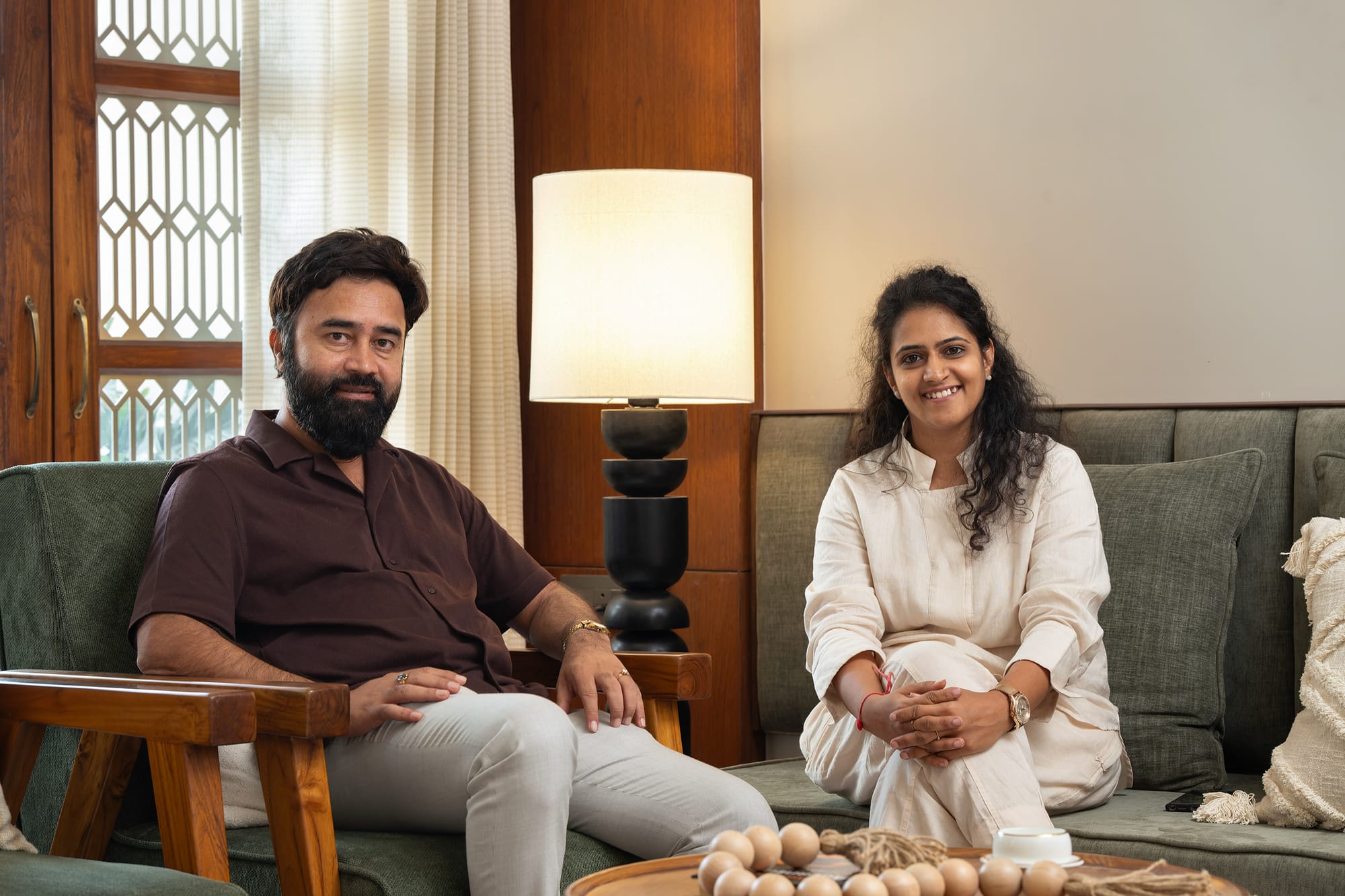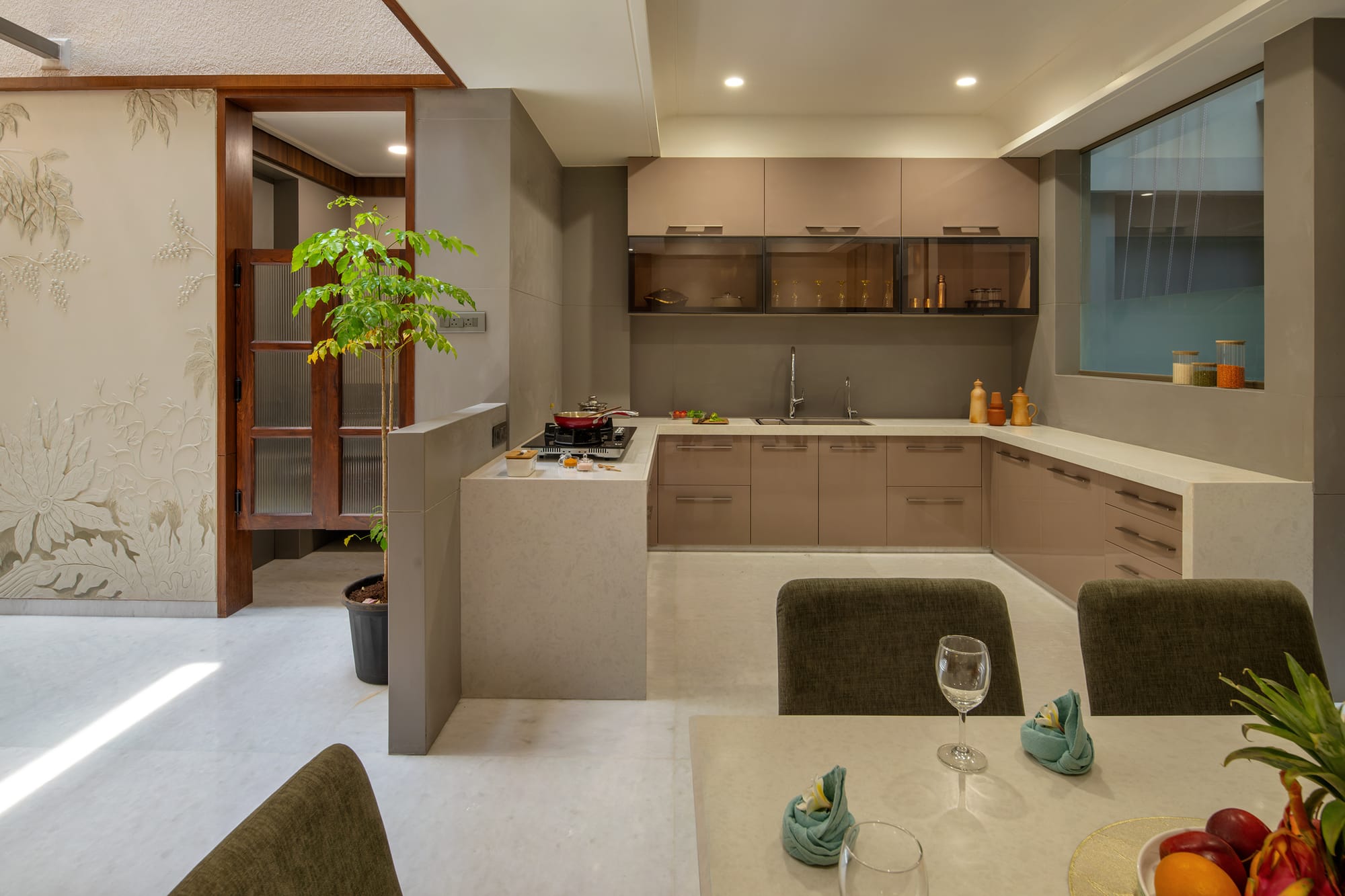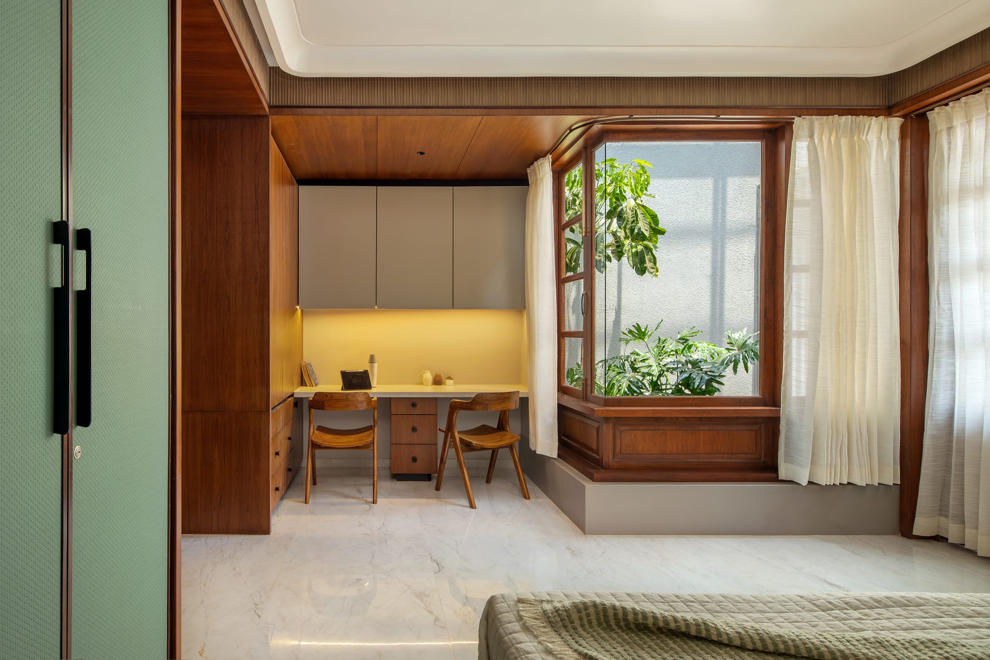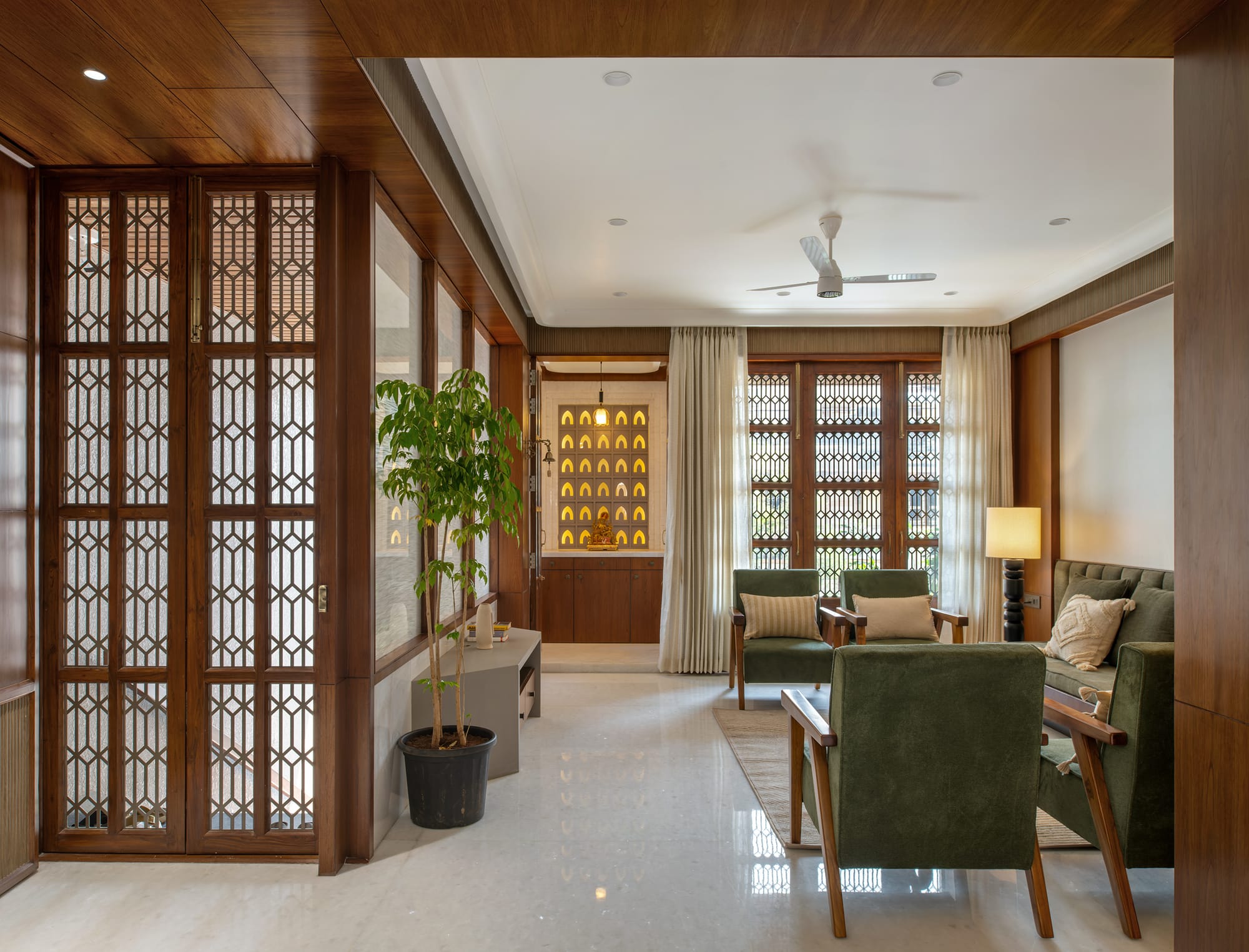 The living room extends from the central core on one flank, while the kitchen and dining area occupy the other. A balcony extends the living room into the outdoors, connected through a custom-made wooden sliding-folding door crafted on site, which stands as a testament to local craftsmanship. The jaali detailing on this door adds a refreshing counterpoint to the built-in seating and furniture, which are function-forward, lived-in, and laid-back in design.
