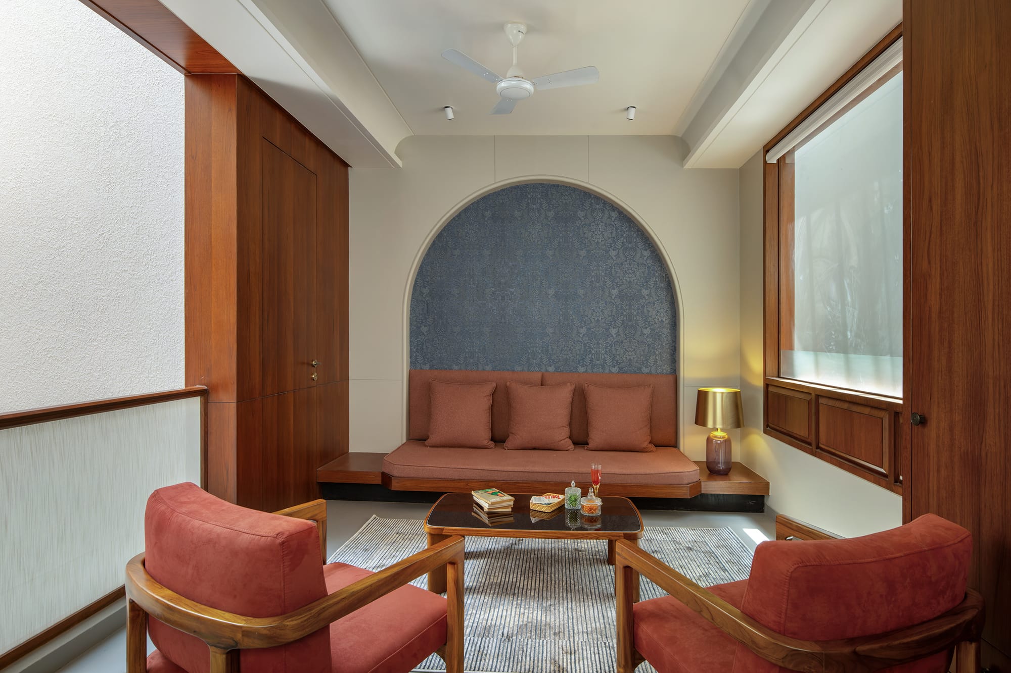 In the family lounge, built-in seating nestled within an arched niche, complemented by minimalist furniture and brass accents, reflects an approach that is both pragmatic and soulful, prioritising design continuity over extravagance.