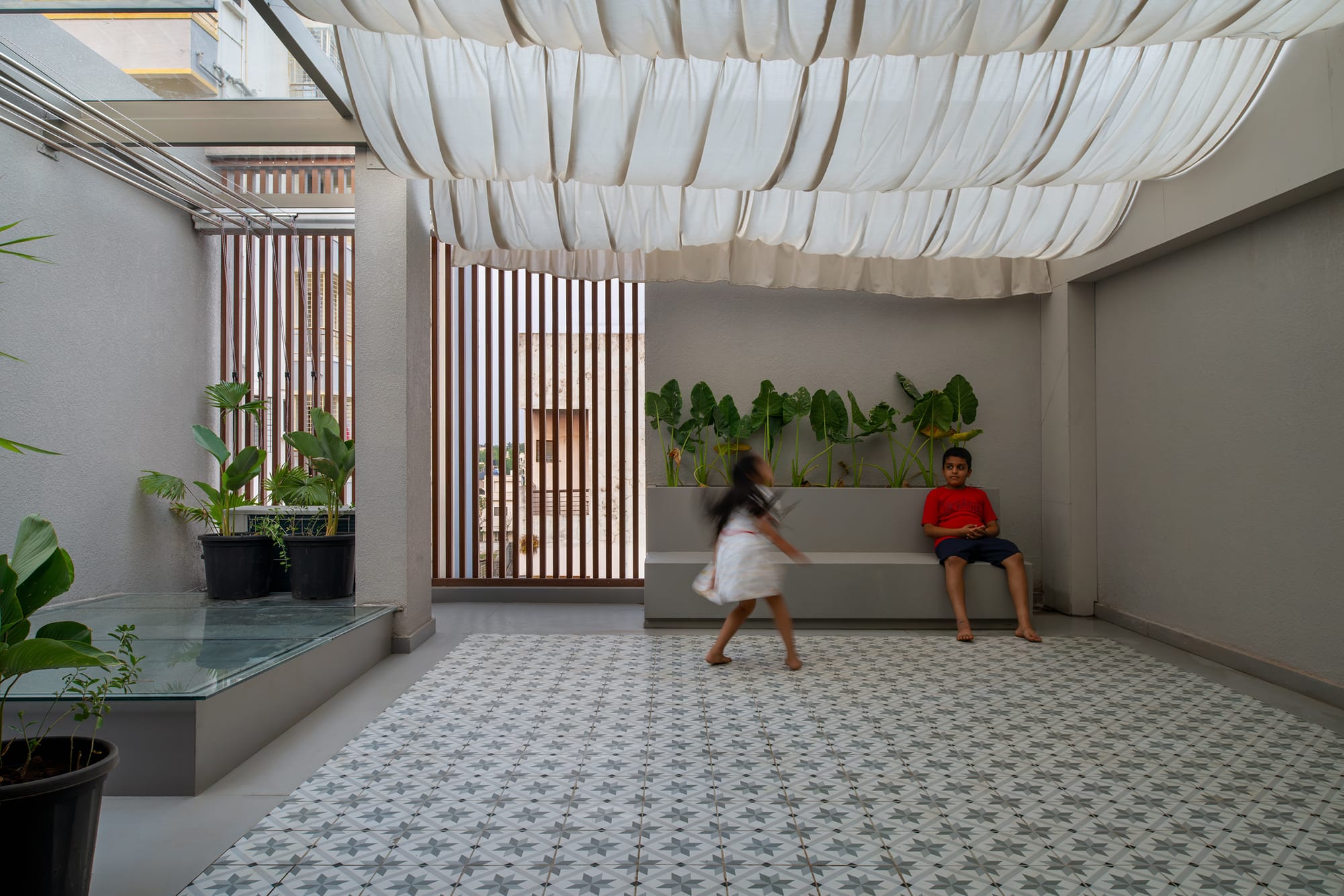 “In spite of a narrow footprint, we have tried to keep the home well-ventilated and responsive to the tropical climate,” remarks Rachana. “We have balcony openings along the front facade—one at the living room, one opening from the kids’ bedroom—the air flows from the living room to the courtyard, then escapes through the louvers at the top.” This stack effect was simulated to keep the home’s microclimate as pleasant as possible throughout the year.